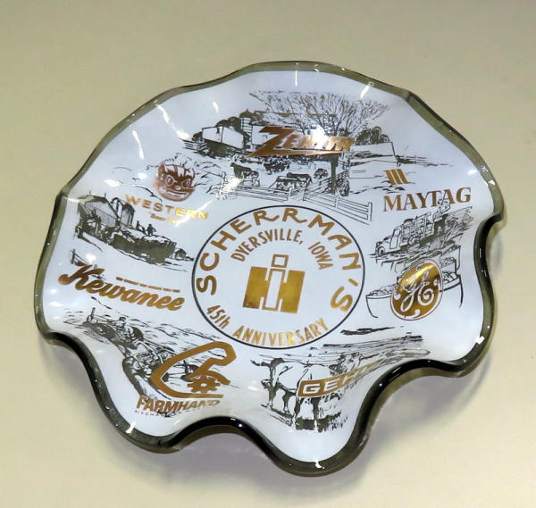 nice graphics, glass, advertises Maytag, GE, Gehl, Farmhand, Kewanee, Western Bobcat & Zenith; 7 1/2" dia.; has a couple small chips on the edges