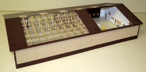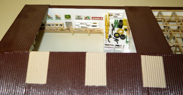 all wood, has a couple of broken stringers in the rafters, nice detail inside with lots of cut-outs of tools and seed corn signs, this one is for display, not made to play with; 1/64th scale, 23.5"x12"
