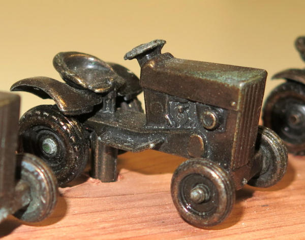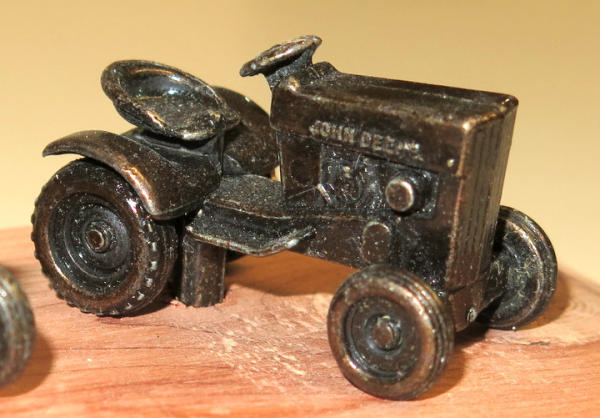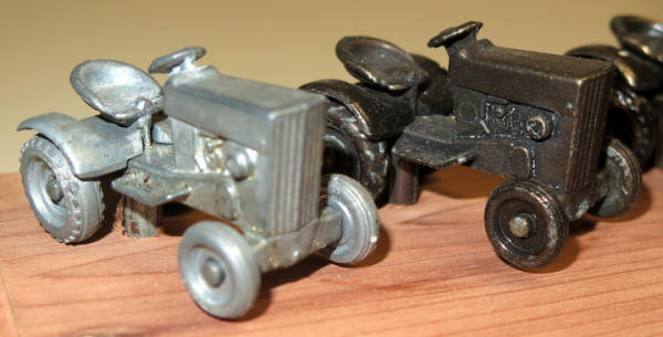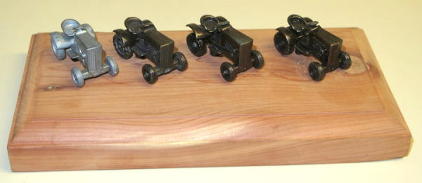 Came from a former Ertl employee, these are the 110 L&G Tractors that were used on the 150th Anniversary Desk Set, shows 3 different samples leading up to the final product, mounted to a wood base for display, rare, 1-of-kind piece for the L&G collector, measures 8" long