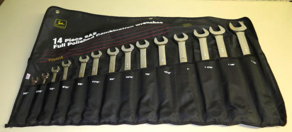 Set #TY24215, wrenches are the polished chrome, made in the USA set with "JOHN DEERE" stamped on each wrench (no logo); I don't think any were ever used, super clean and nice in a nice pouch, great set