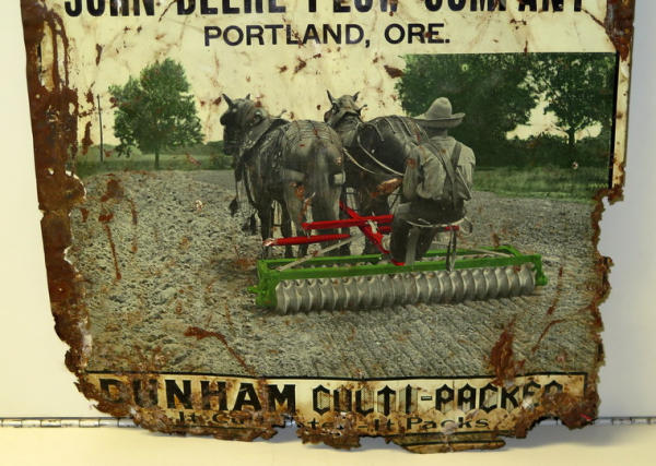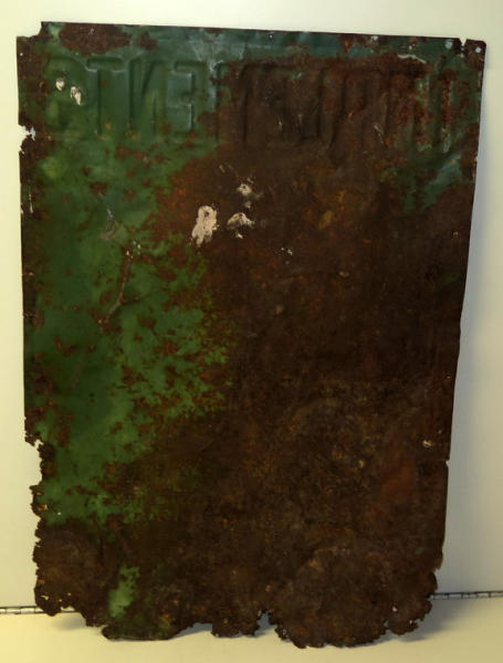 Very early sign, about 13.5"x20; heavy damage to the edges, wrinkled and worn, 100+ year old sign,