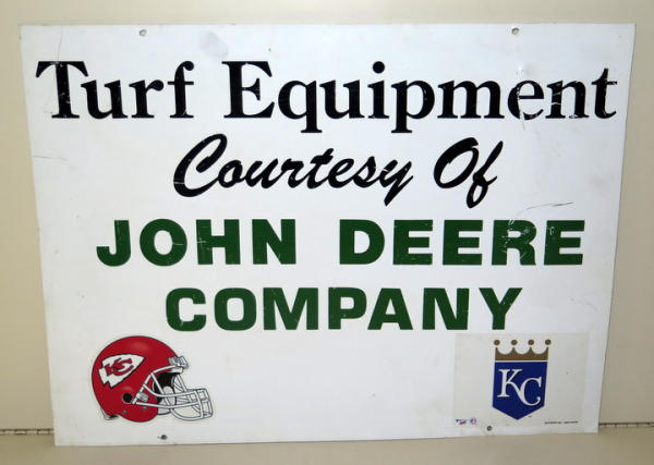 this is the original sign off a piece of equipment used at Royals Stadium & Arrowhead Stadium, 18"x24", has some scuffs and scratches, the logo decals are only on one side; originally from the Ken Buell collection