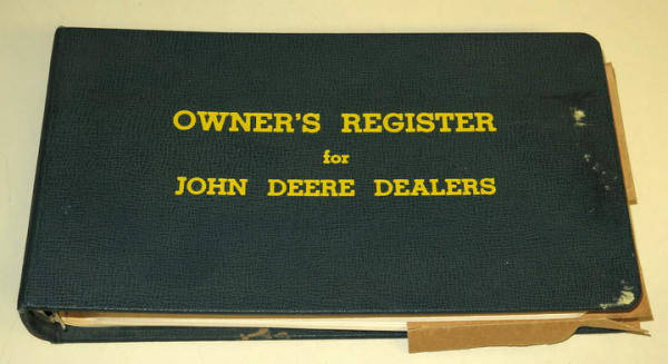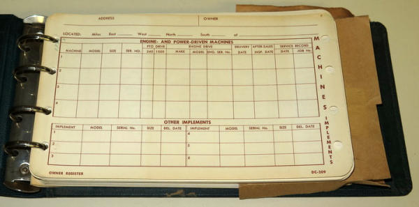 never used, hardcover, about 1" thick, used so Dealers could keep track of what customers' bought what equipment, light wear to the cover