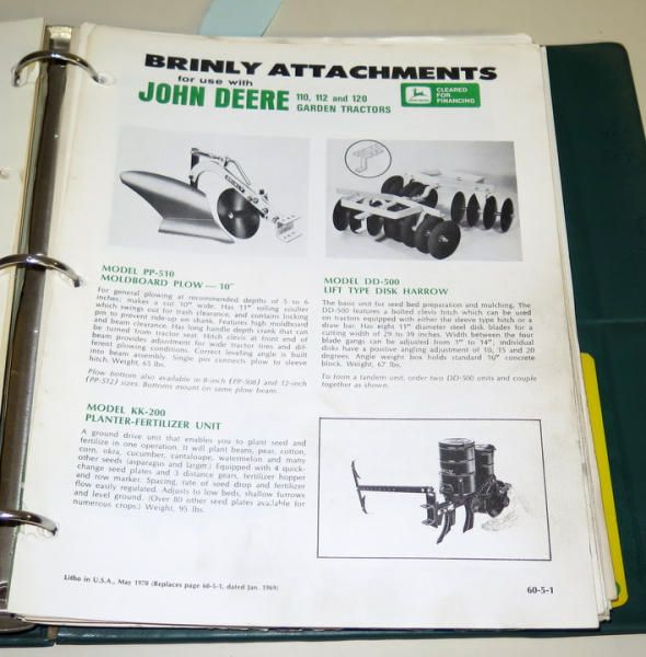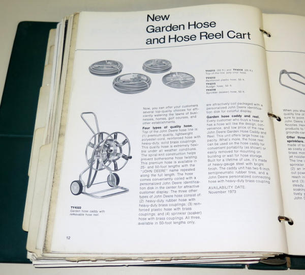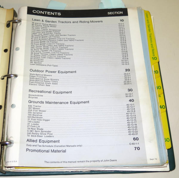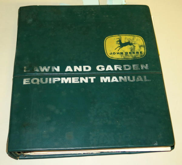 Binder is 4-leg and has quite abit of wear, about 1.25" worth of contents, dated around 1973; shows a lot of Garden Tractors & equipment, but also has the Bicycles, Ground Maintenance Equipment, Brinley equipment & short line equipment, JD Tools, hand tools and more; great piece for the L&G Collector