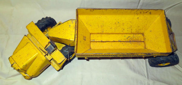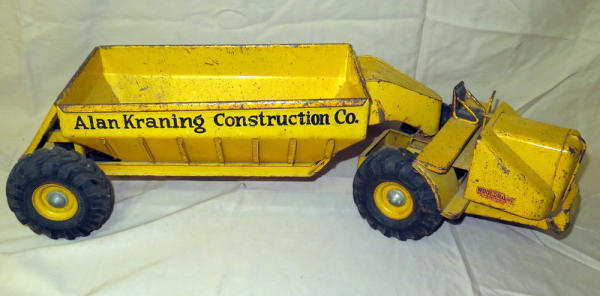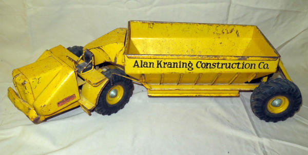 played with original; Construction Co. on side has been hand painted on; surface rust on a few places and paint loss; 24" long