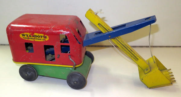 early pressed steel toy; color is nice but does have some play wear; wood wheels; 13" long