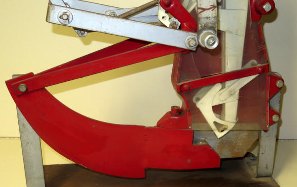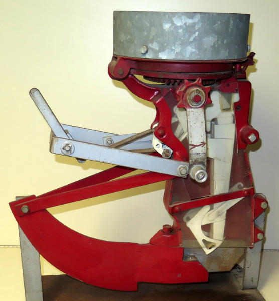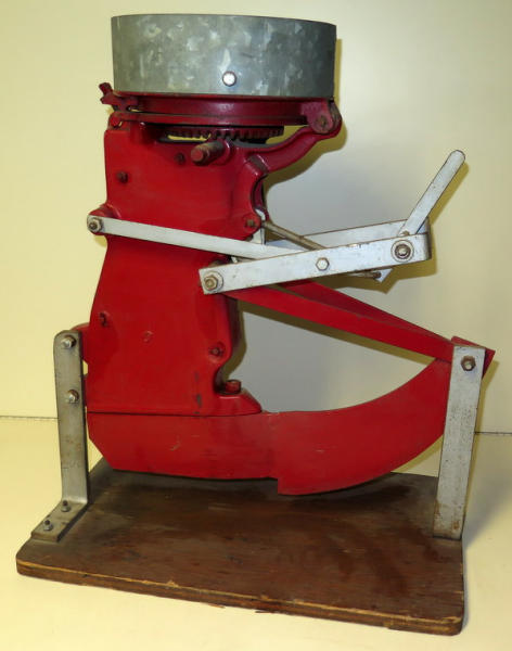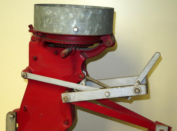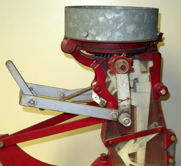 unique, full size planter unit with clear plastic sides to show the mechanics, has just a small planter box on the top, turn the crank to show how it works, heavy, has some general wear and could use a cleaning