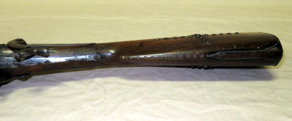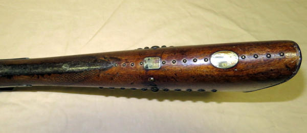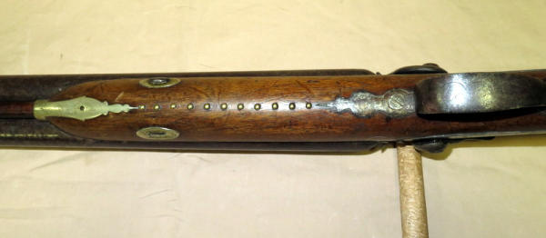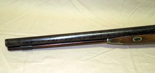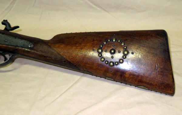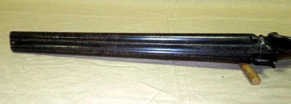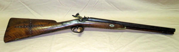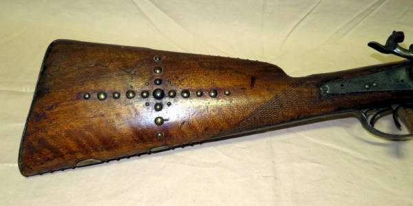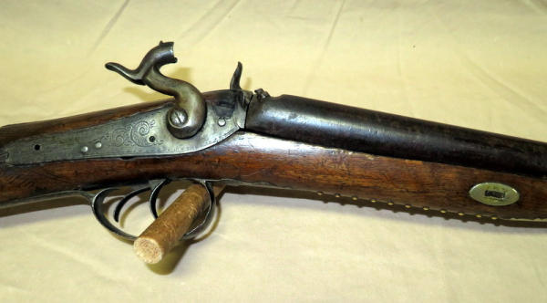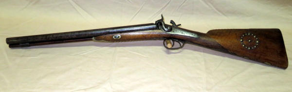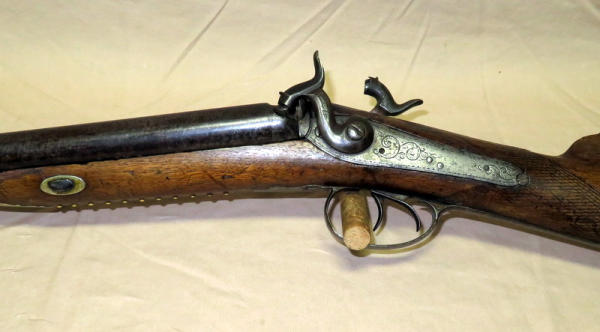 18" barrel; does not appear in working condition; one hammer is stuck; 2 triggers; fancy design on stock & metal; neat old wall hanger; No FFL transfer needed