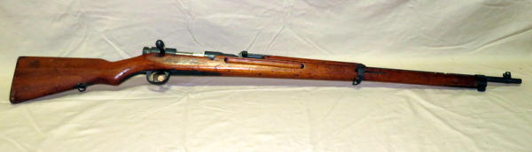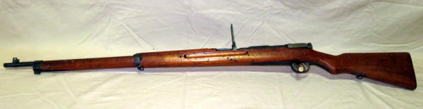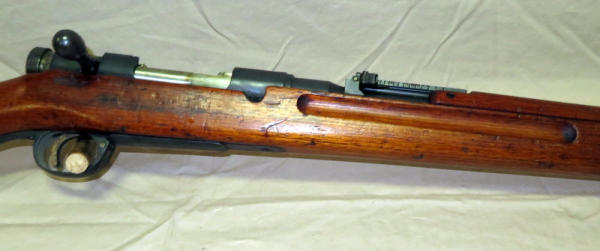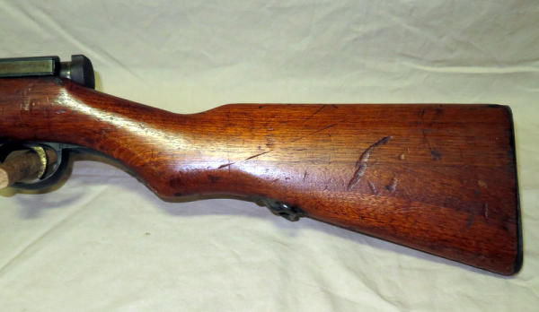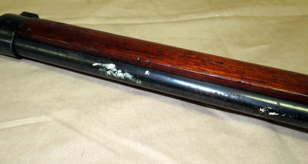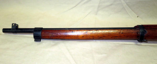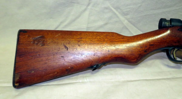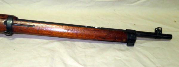 entire gun is 50" long and 31" barrel; wood stock has field marks and scratches; barrel has some surface rusting & paint marks; pop up sights; not sure on caliber or maker; has some Japanese writing; SN#21431