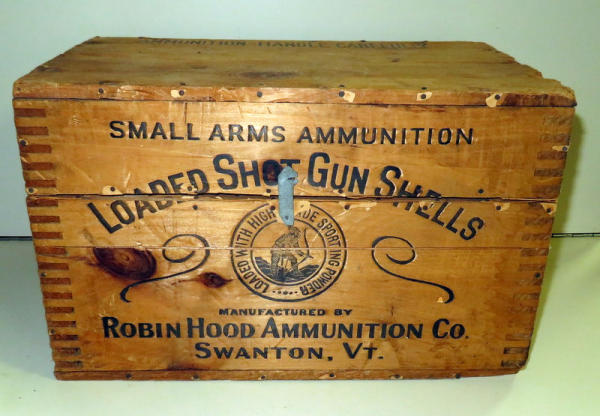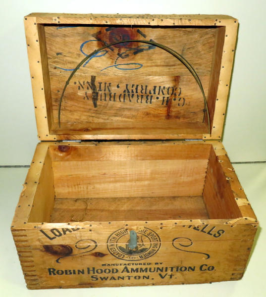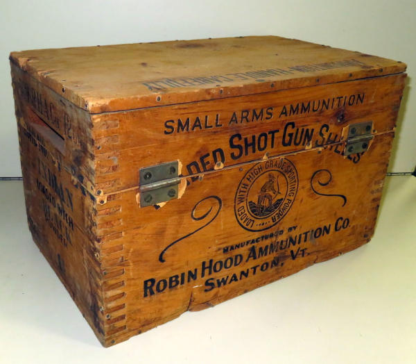 Hard to find wood crate for Shot Gun Shells by the Robin Hood Ammo Co. of Swanton, VT. 15"x10"x10". The lettering is very dark and bold still w/a great logo. Has been cut in half and put hinges on it to make it a box that opens. Even with the damage, still very desirable box!