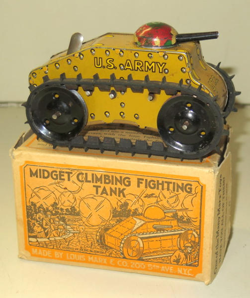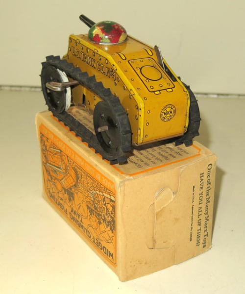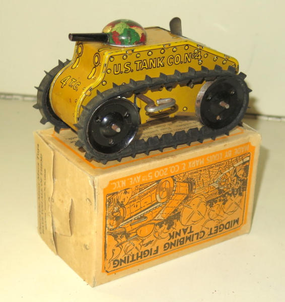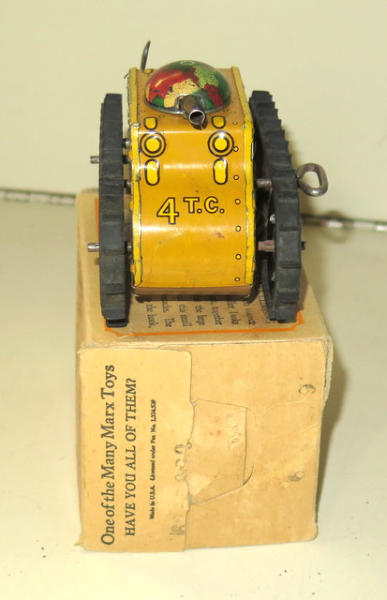 5.5" long, windup works with a little help, rubber tracks are good, toy is near mint, box is nice with some light wear, has all the flaps