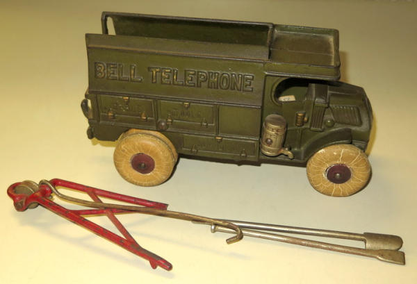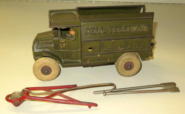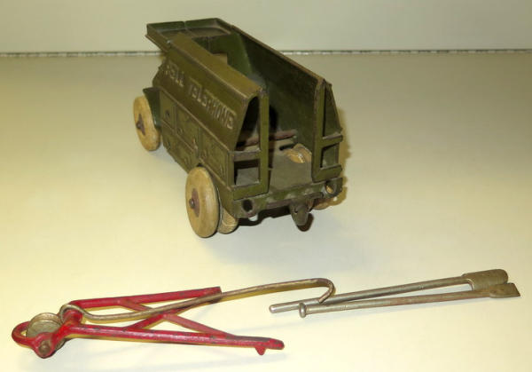 9.5" long, very nice original, paint, gold highlights are worn off the letters, includes a good spade & tamper, winch has a broken arm, overall still a nice toy