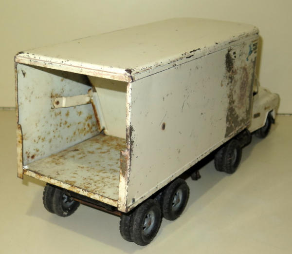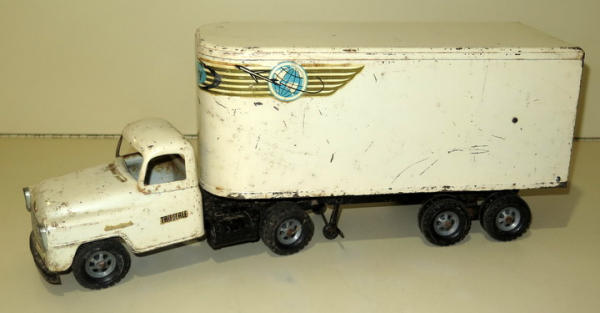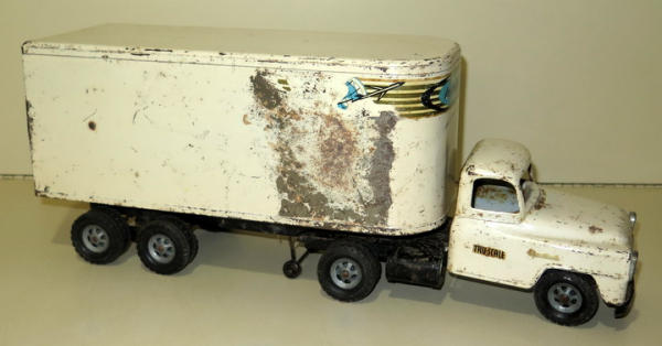 Rare truck, one side displays OK, reverse side has pretty large spot of paint loss, looks complete and pretty straight, I think we have only sold this truck 1 or 2 times, they are a rare Tru-Scale Toy