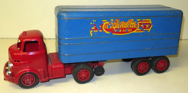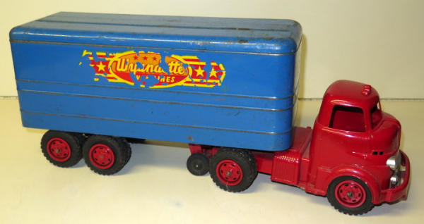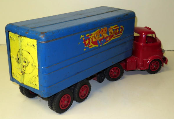 Red cab has been repainted, Trailer is original with heavy flaking on the decals
