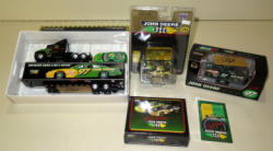 #412 - Box Lot of JD toy NASCARS--1/64th Semi, 1/43rd #97 Car, 2pc 1/64th set in Tin & Gold 1/64th