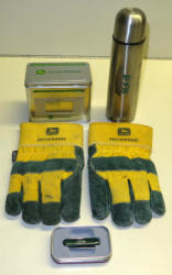 #448 - Lot of JD Advertising--Bullet Rotor Thermos, Arctic Gloves, JD Classic Knife & Tin Box