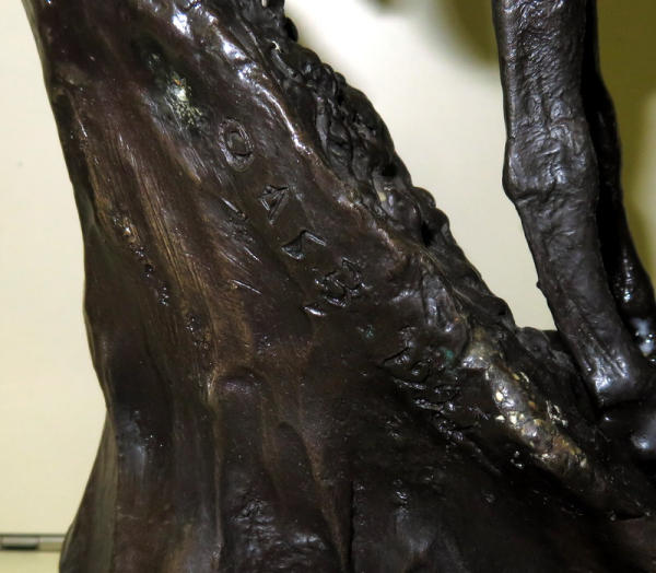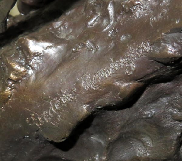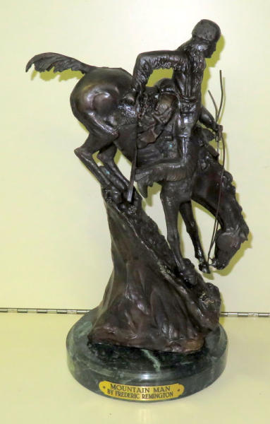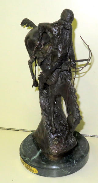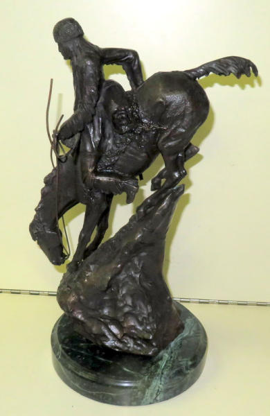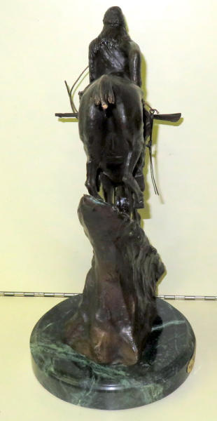 marked 1922?; on marble base; very heavy & highly detailed; man on horse going down a steep cliff; 15" tall; believe this is a reproduction casting of an original