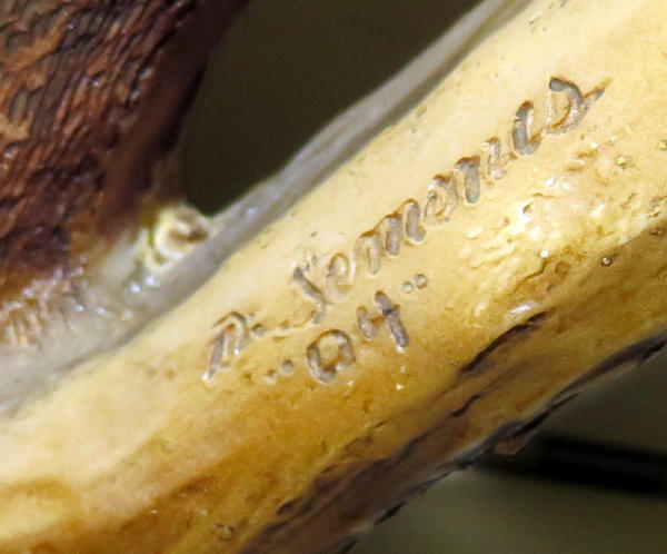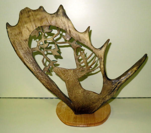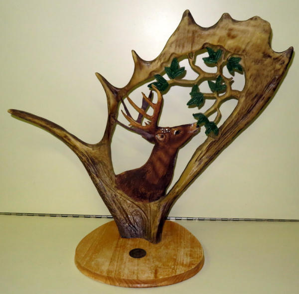 believe this is a ceramic material; nicely detailed & painted of a buck eating from a tree; 18" tall; marked D. Semones "04"; on wood base