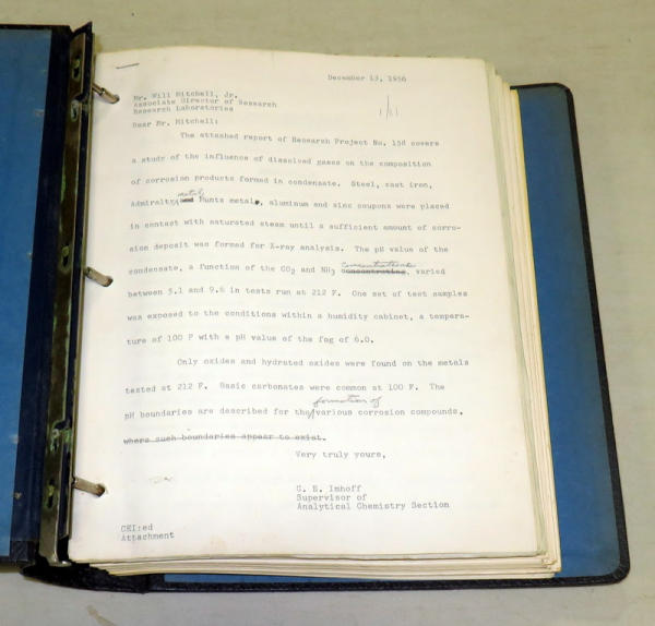 has report on a Research Project for corrosion of different pipes used by AC; binder is in ok shape