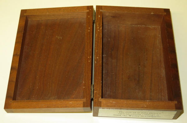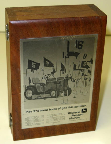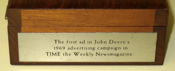6.5"x4.5", has a plaque on the front that reads "The first ad in John Deere's 1969 Advertising Campaign in "TIME" the Weekly Newsmagazine"; light wear, never seen this unique piece of L&G before