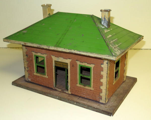 14"x9.5", early toy, paint is about 70% or so, has brass "Waiting Room" signs above the doors