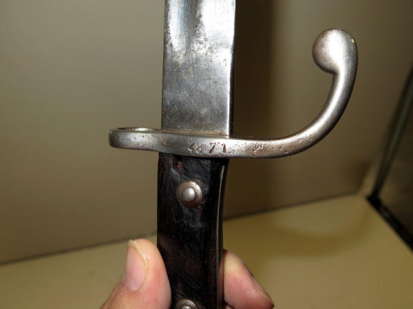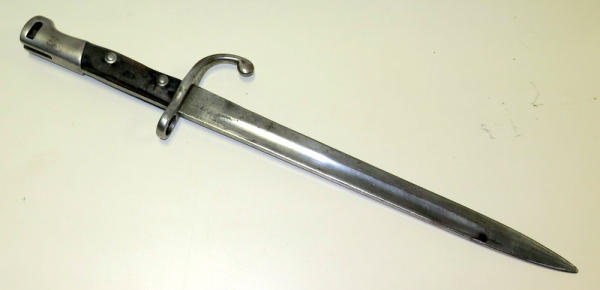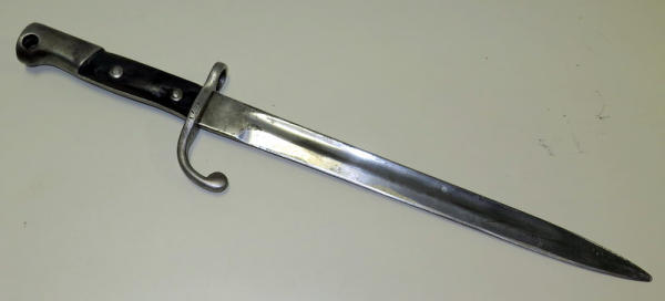 no scabbard, missing button on bottom of handle; makers mark is worn; 17" overall