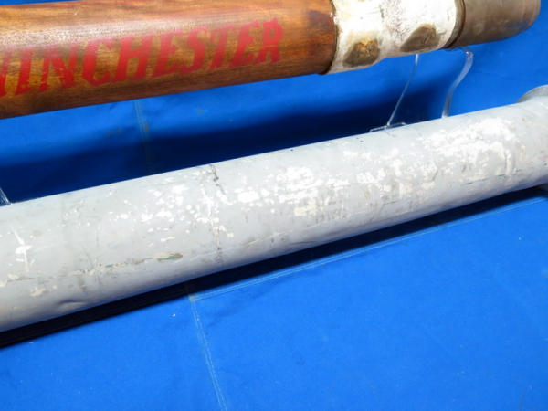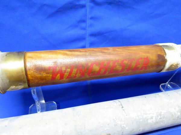 believe Winchester was added to this; includes original canister; very heavy; shell 29.5" long; bottom cork is gone; prefer no shipping due to weight