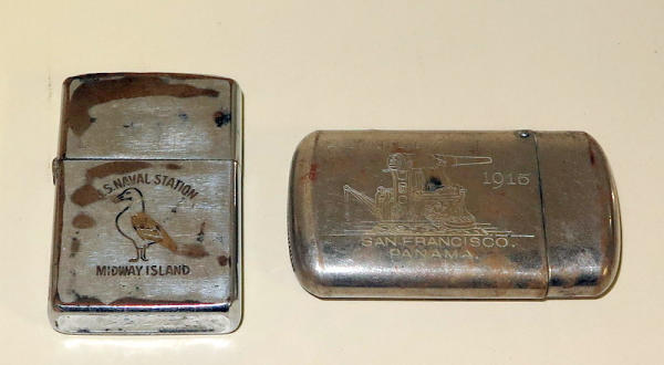 Lighter is marked "US Naval Station - Midway Island" & Match safe is "San Francisco - Panama" w/picture of cannon; both used condition; sell 2x the money