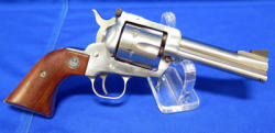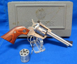 5.5" stainless barrel; near mint condition; wood grips; comes with .22Win Mag cylinder; factory plastic case; nice; single action; SN#266-01219