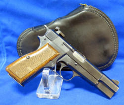 4.75" BBL; wood checkered grips; Belgium made; has the red painted inside of grips; bluing is a little worn but overall a very nice example of a sought after pistol; comes w/factory zipper case & 1 clip; SN# Shows this was mfg. between 1969-1977; SN#73C93172