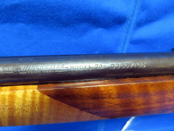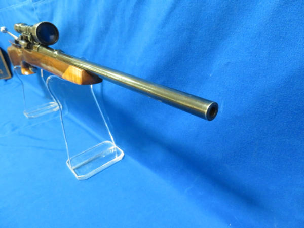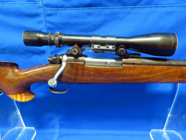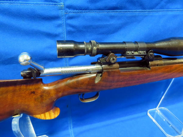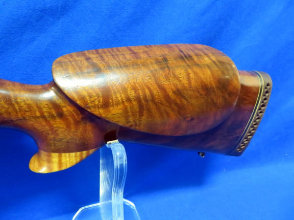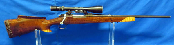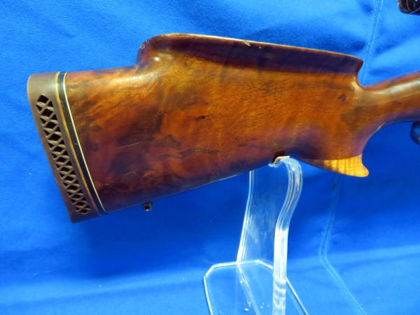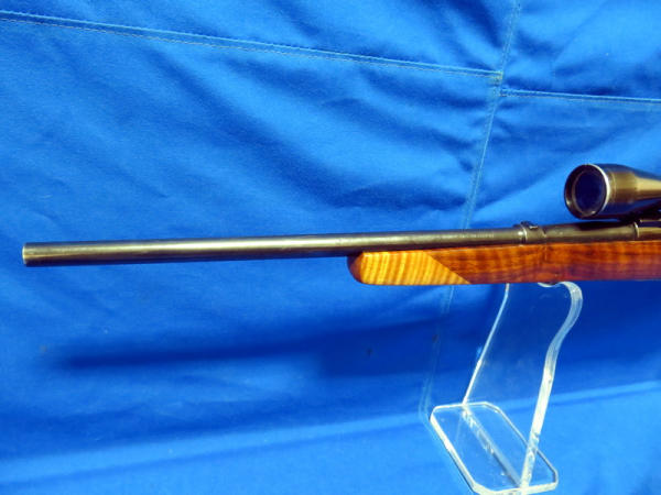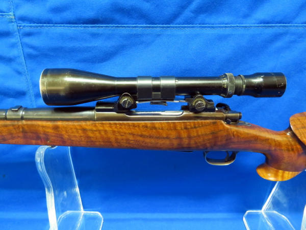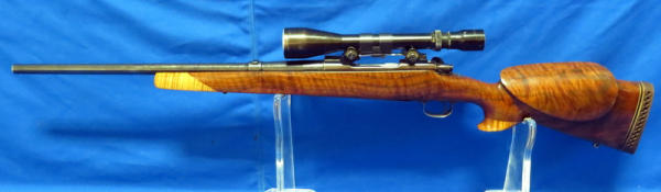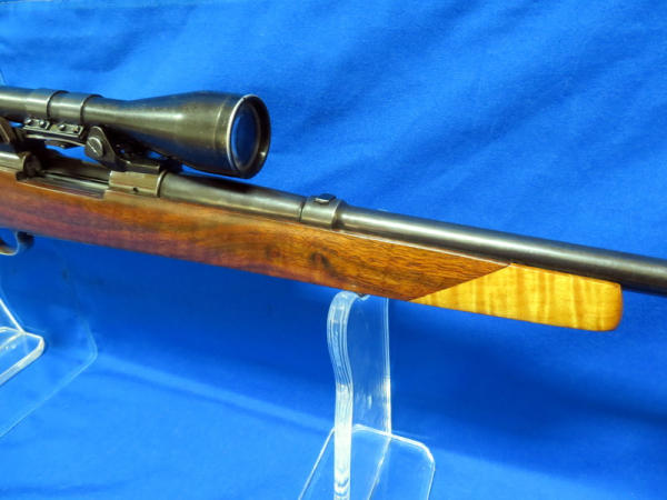 20" BBL; barrel has been shortened; stock accented w/curly maple on grip cap & forend; custom stock w/high roll-over cheeck piece; bar scope has some wear; smooth action; nice looking gun; SN#43294