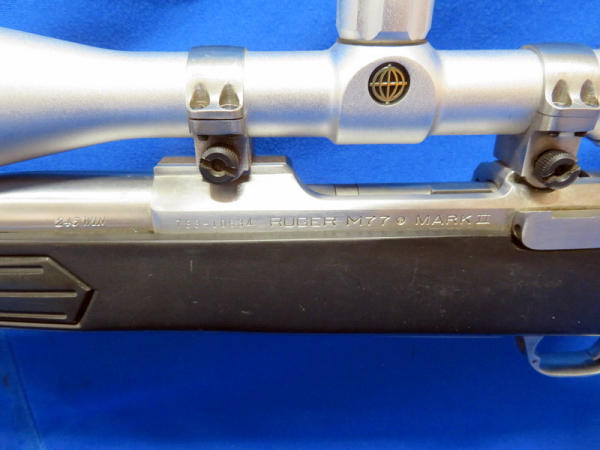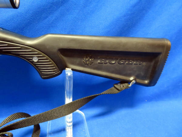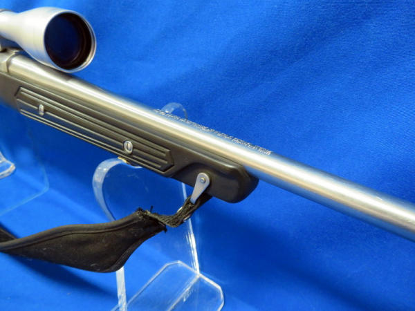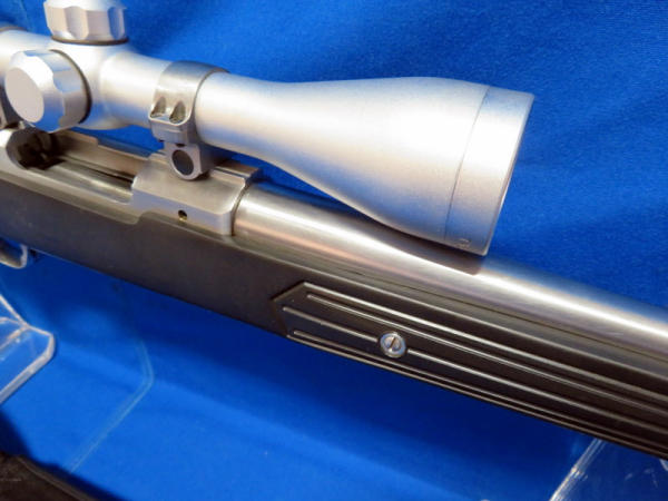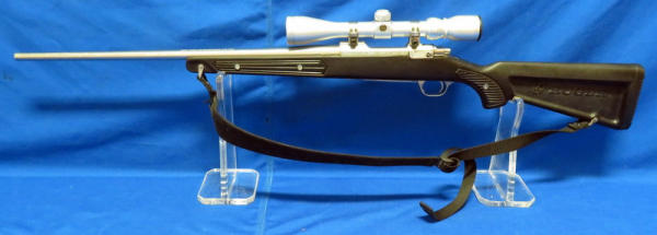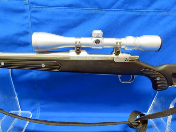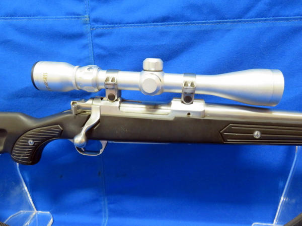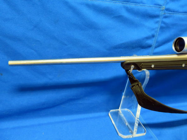 22" stainless barrel; black synthetic skeleton stock; gun has been fired and shows a few marks of field use but overall still very nice condition; action is smooth; Tasco 3x-9x40 Scope; sling; SN#783-10634