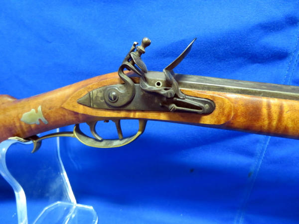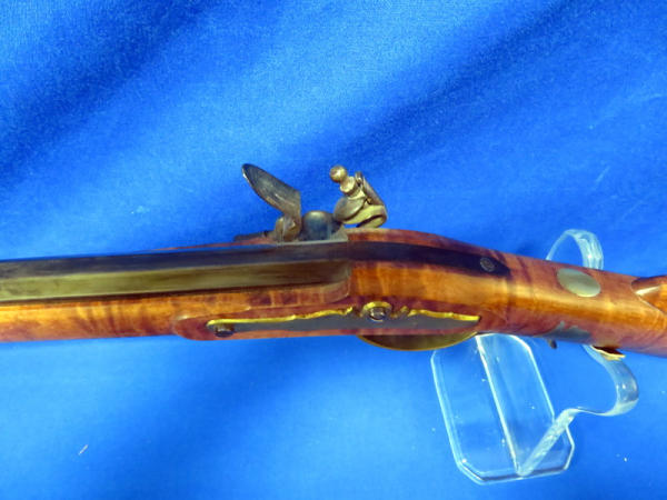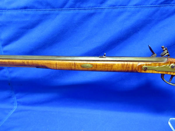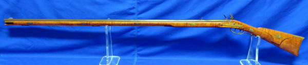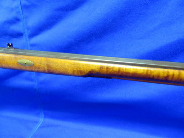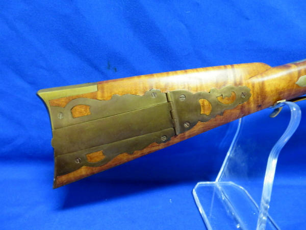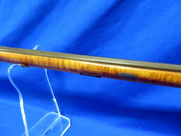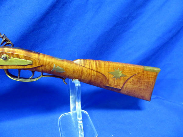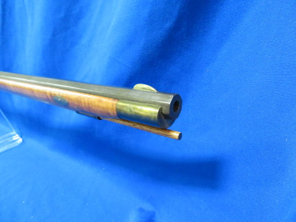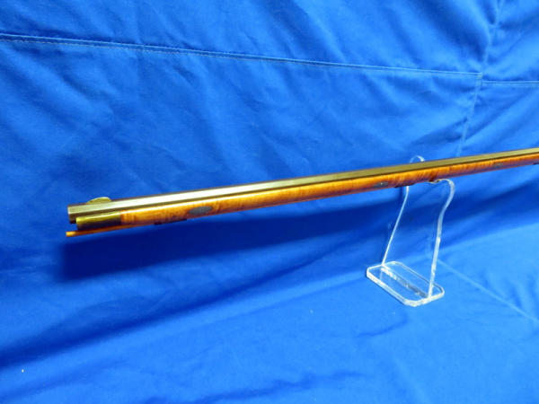 extremely heavy 48" octagon barre; finish on entire gun is very nice; has brass powder box and brass pieces inlaid all over the full stock; no FFL transfer required; no makers mark or marking; nice looking firearm