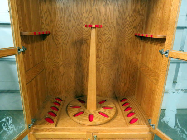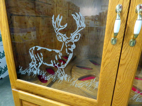 Nearly 8' tall, exact measurements 91"T x 48"L x 25"W; lighted; crown molding, etched glass front; large double drawers on glides to come all the way out; lazy Susan in the middle; holds 18 long guns total; has keys; drawers are large enough to store several pistols or even shorter rifles; this is a very impressive piece and would be a great addition to someone that likes to show off their high grade firearms behind glass! NO SHIPPING, local pickup only!
