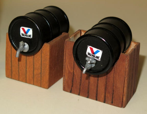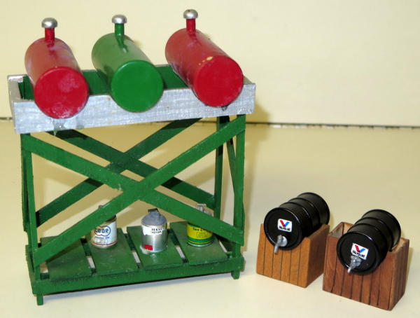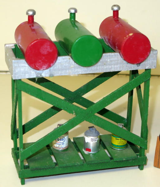 about 1/16th scale, mostly wood, has some general wear, cans are glued to the stand, all to go