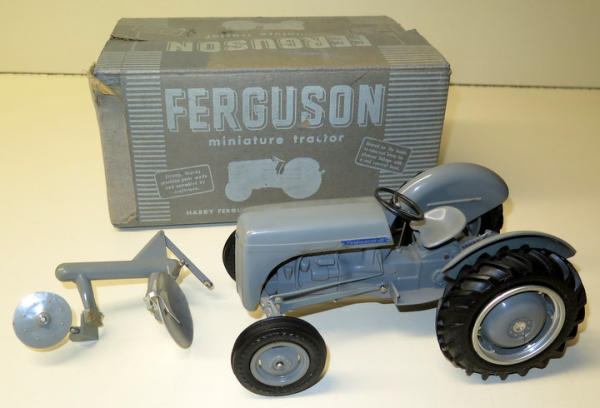 toy has light damage to the 3pt and cracks in the two rear rims; could use a detailed cleaning; Plow is missing an entire bottom; Box has some fading, but square and complete, has the box liner too