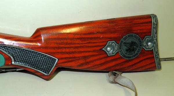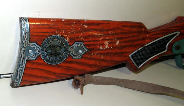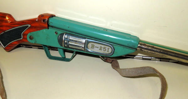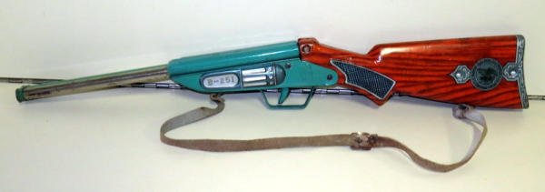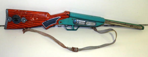 painted tin; marked w/the Bandai Toys - Natio - Nal - Rifle 1956 logo; original sling; works; overall fairly nice condition; 20" long