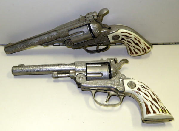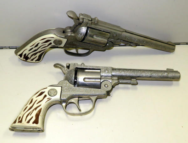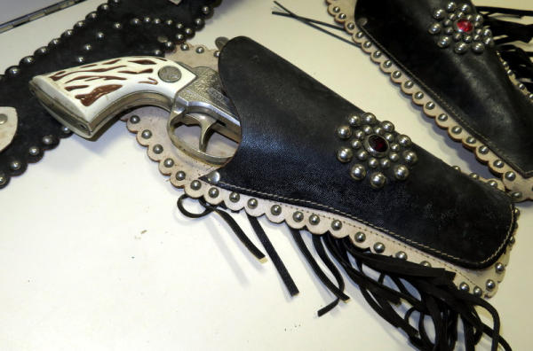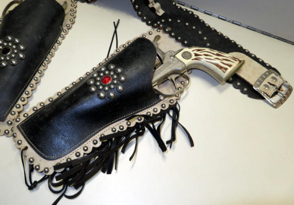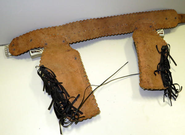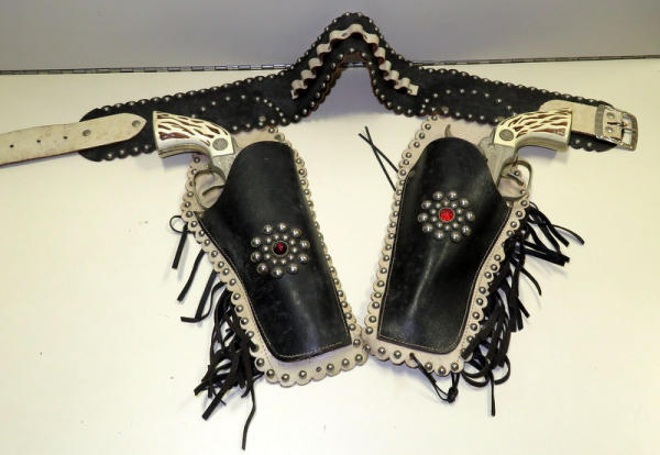 leather is nice and pliable; could use a little cleaning; cap guns match and both work; nice looking cap guns