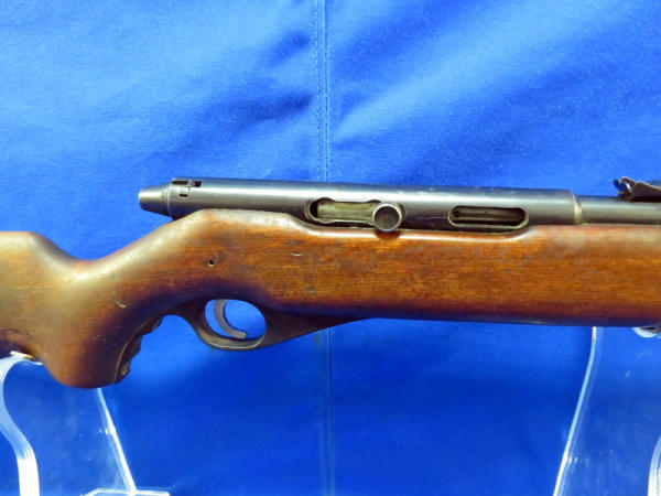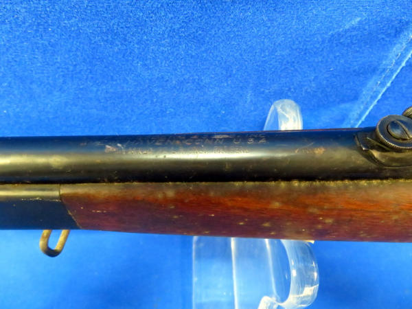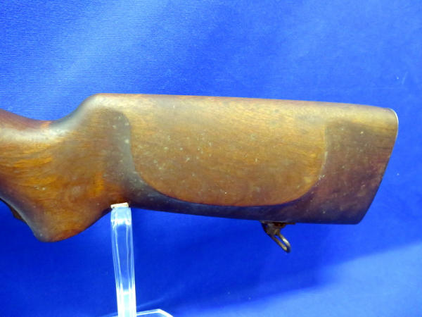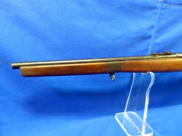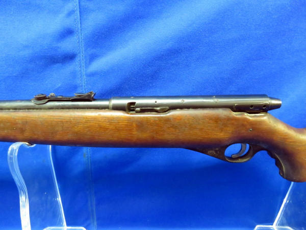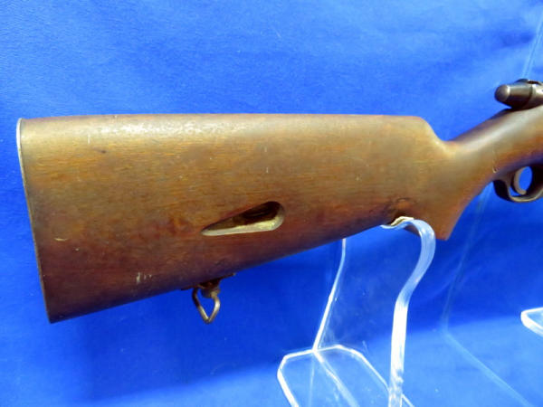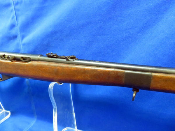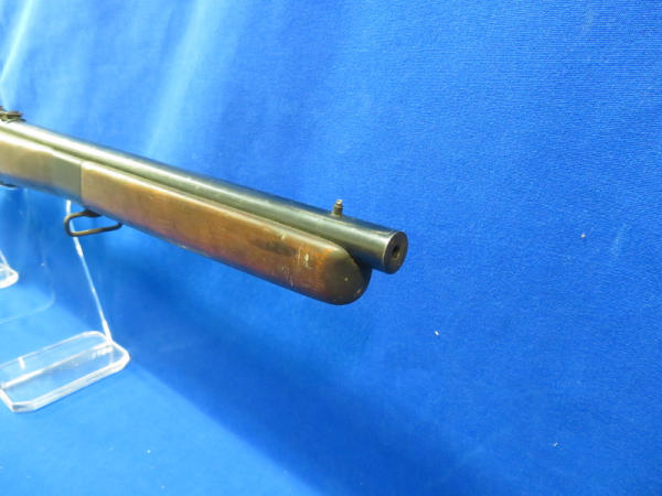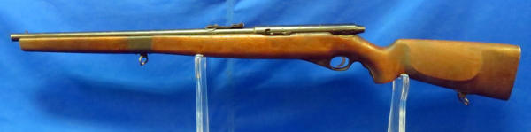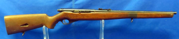 20" BBL: missing front sight, has a set screw in it's place; has a cool military look to it; wood is solid but has some staining and finish loss; top of barrel looks like it's been tapped for scope mount; bluing is spotty; no SN#