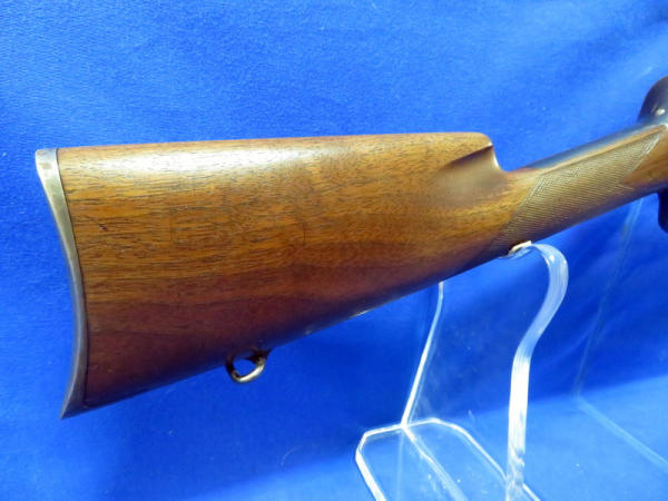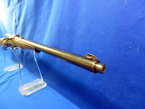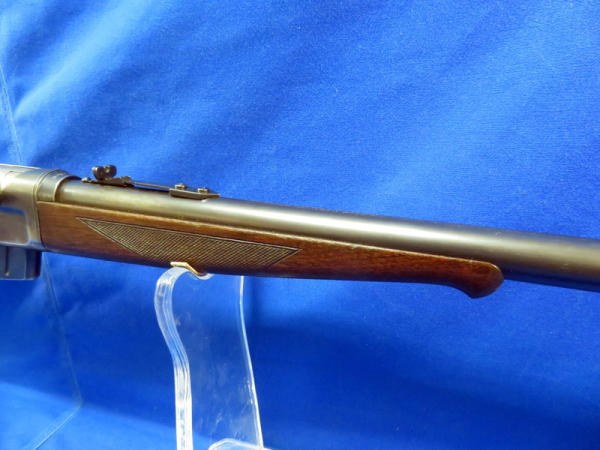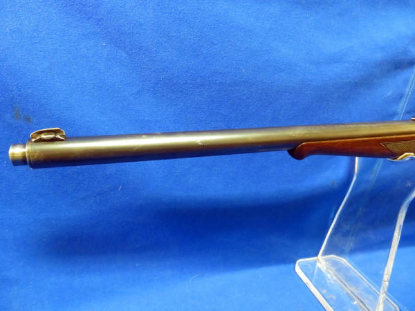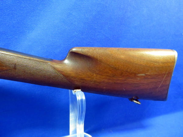 22" BBL; rear adjustable sight; extra thick barrel; bluing thin on receiver; wood is solid w/nice dark color and checkering; been drilled & tapped on side of receiver; SN#946