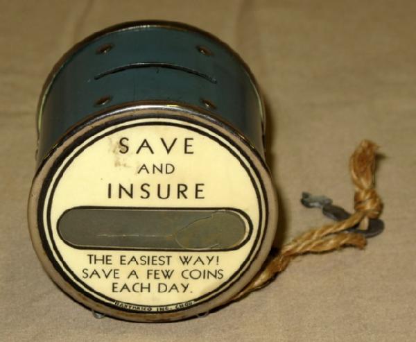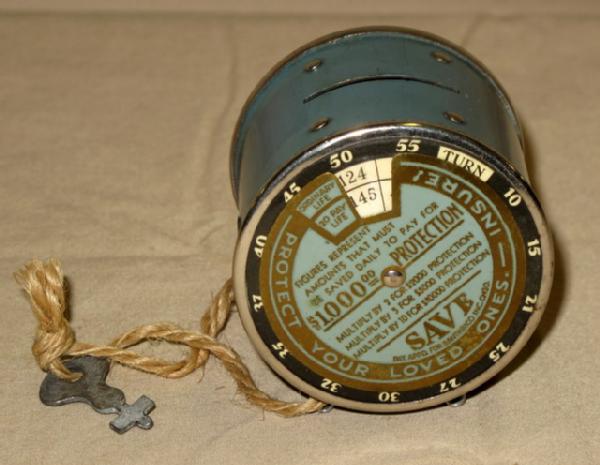 From an insurance company, 2.5" diameter, has the keys, celluloid on back side has a crack, overall a neat bank