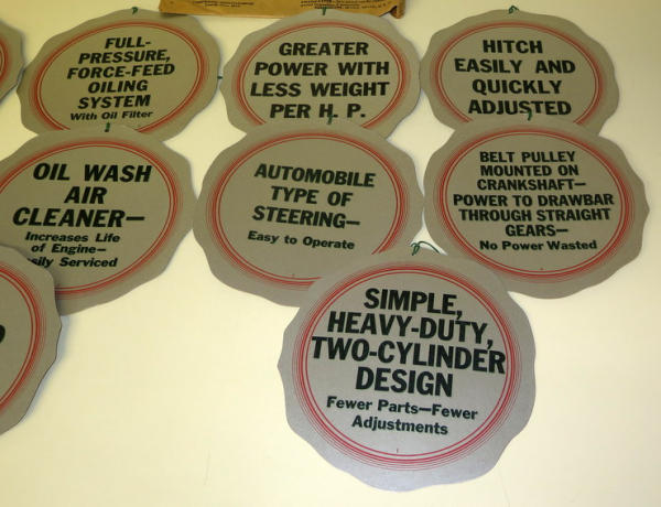 Great set, includes 10 cardboard string tags that are each 9" across and have a small number corresponding with the graphics on the envelope so the dealer would know where to hang them, tags are all near mint, envelope has some tears and wear, but overall good condition; a great find for the model D collector!