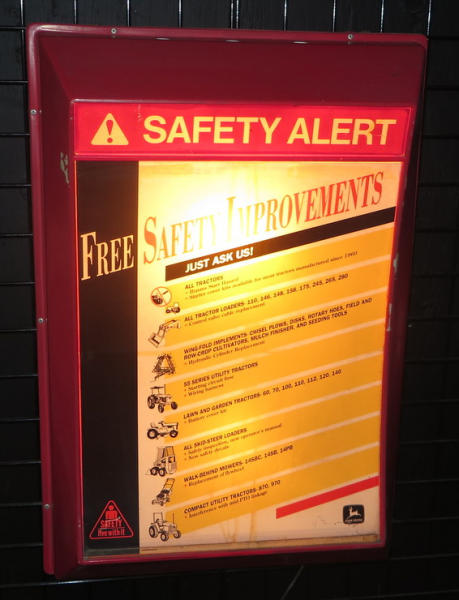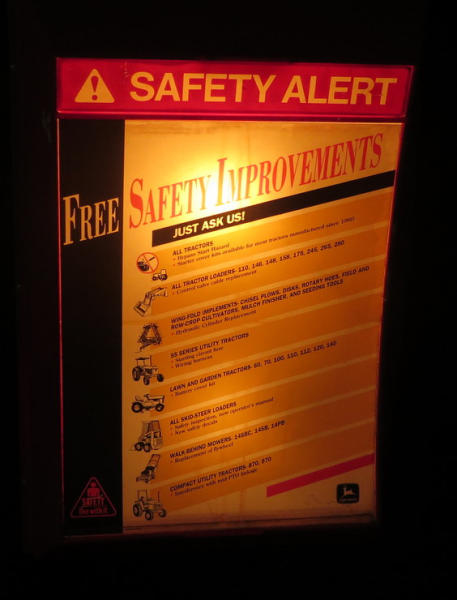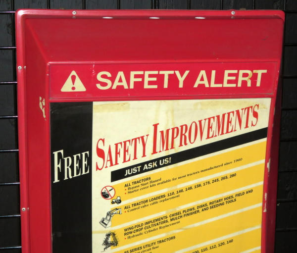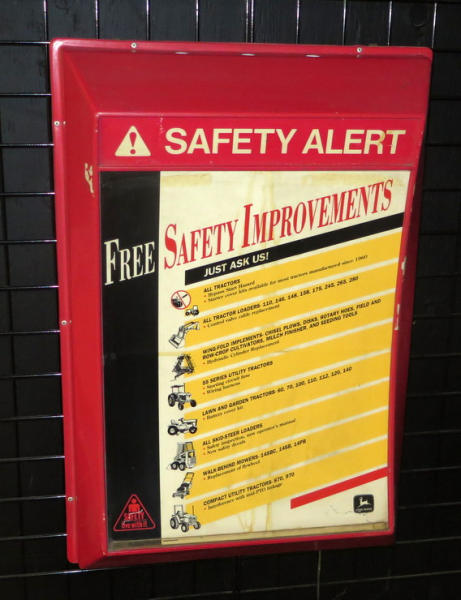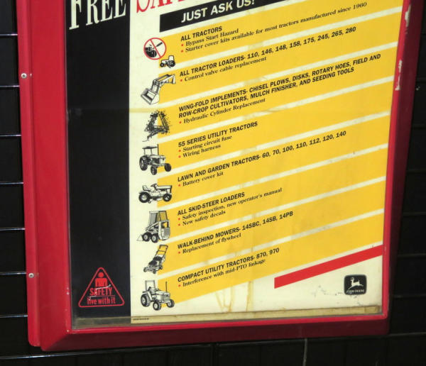 works, plastic body, 24"x35", has some discoloration and general wear; I was told the JD dealers didn't care for this sign since it said what was wrong with several pieces of equipment