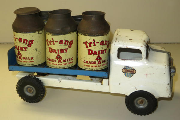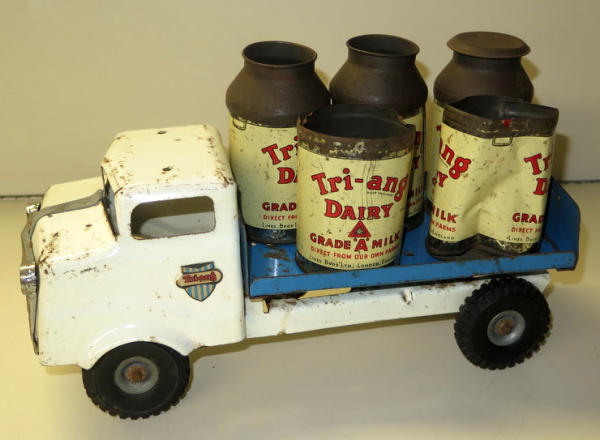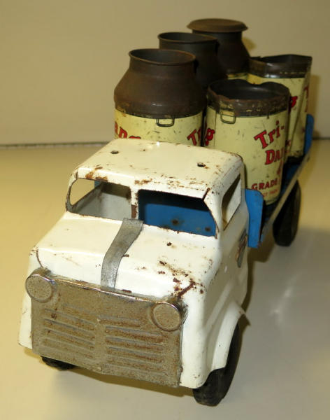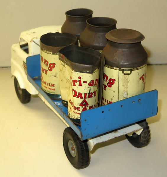unique European Truck, paint is about 75%, one can is pretty nice, 2 are missing lids, 2 are missing the entire top and one of those is smashed, sells as a set