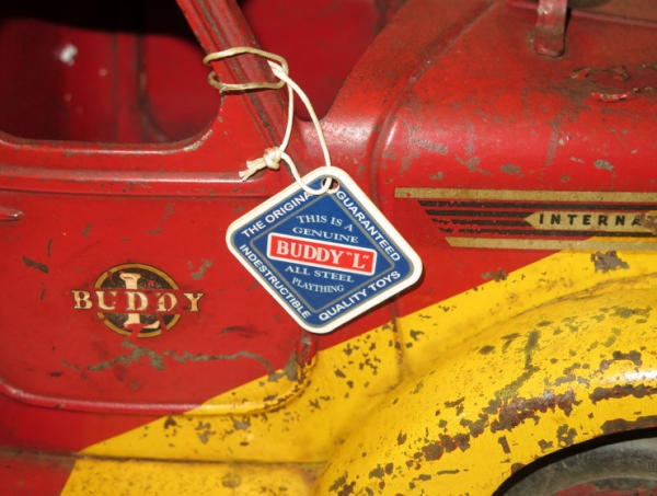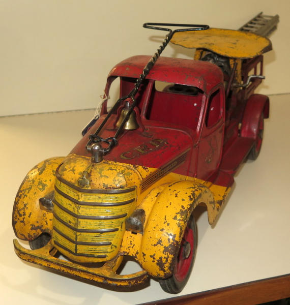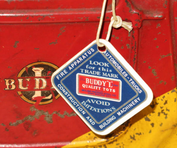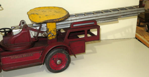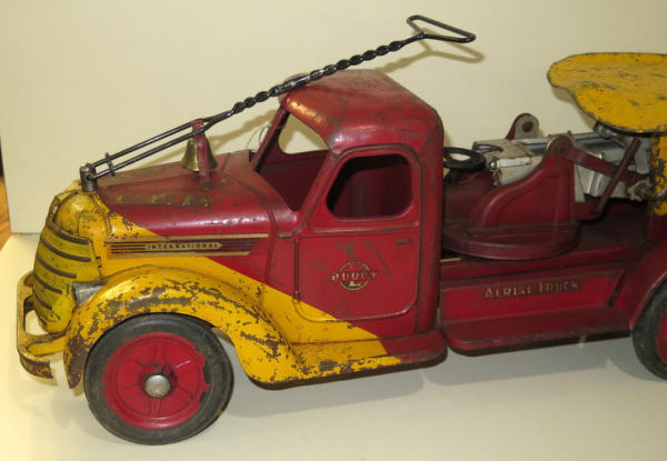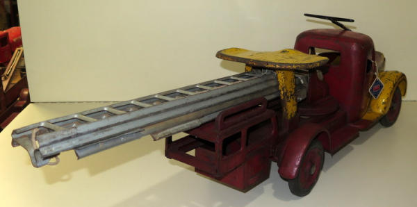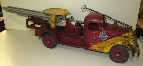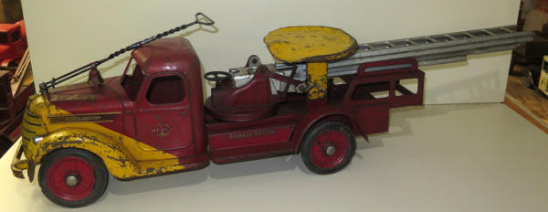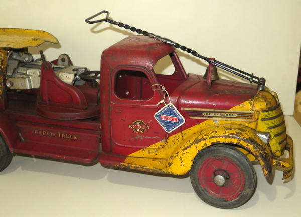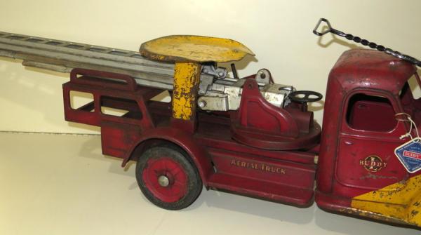 scarce toy, late 1930's style truck, paint is about 70%, looks to be very complete, seat comes off to raise the ladder, has an original Buddy L hang tag too! 42" long,