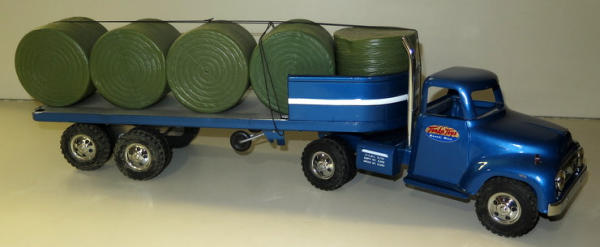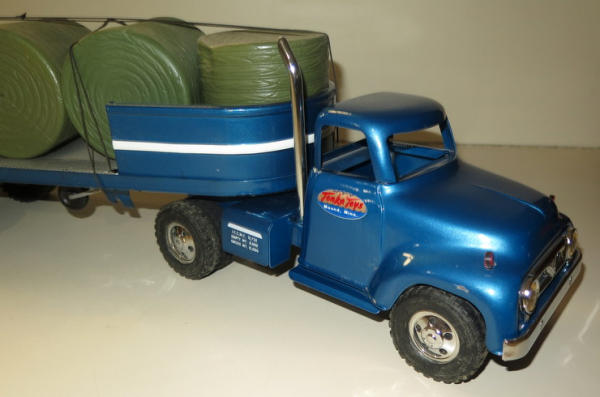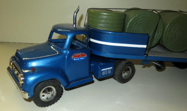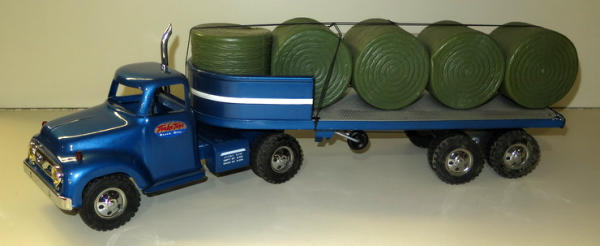 Built from 1956 Cab, nicely painted, trailer built from various vintage parts, some general wear, includes a load of plastic bales