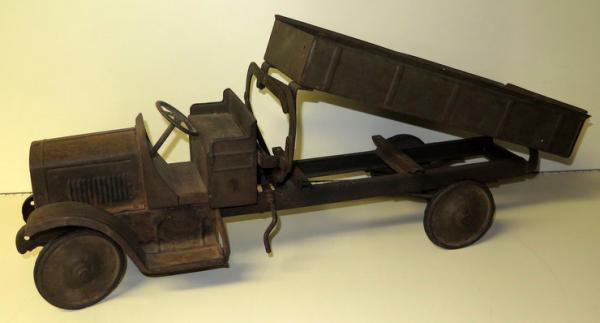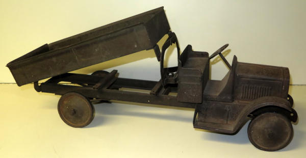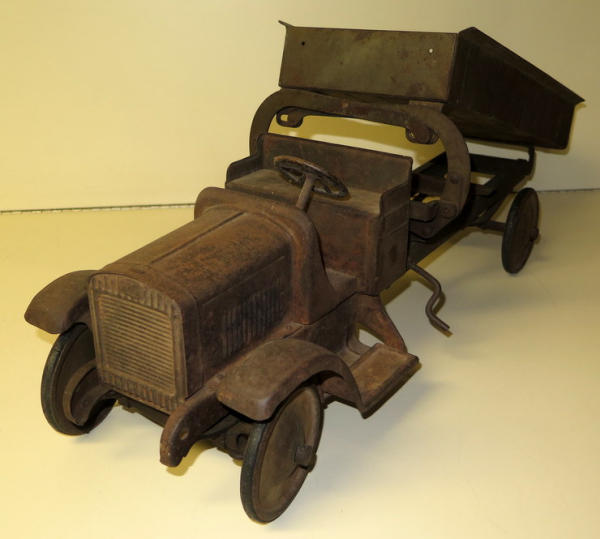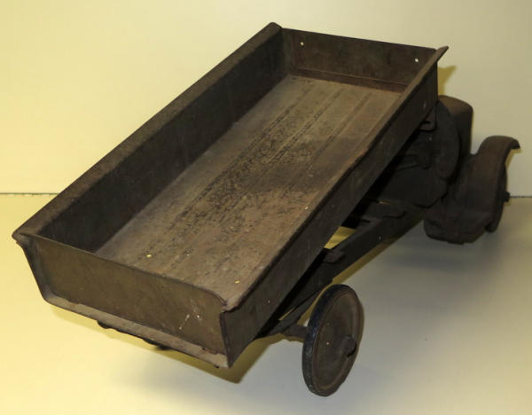 26" long, unique dump mechanism, straight, nearly no paint left, not sure on the maker
