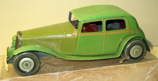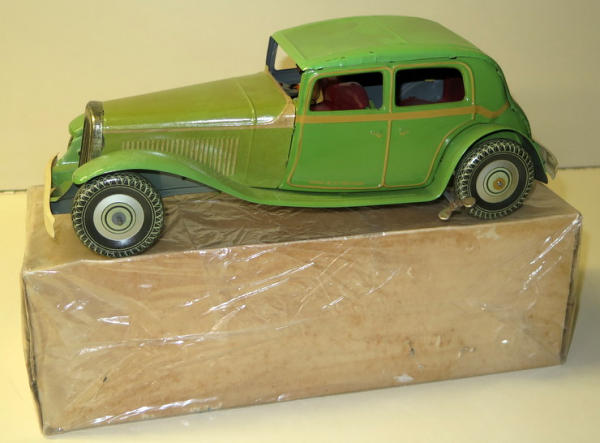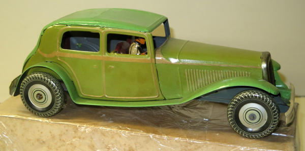 made in Great Britain, 14" long, some discoloration on the roof and hood, overall near mint paint with nice original white paste-board box,