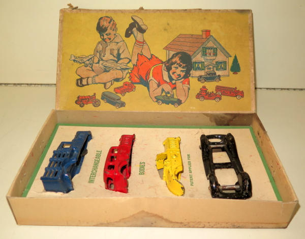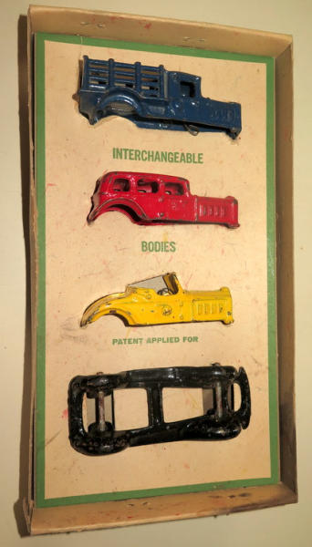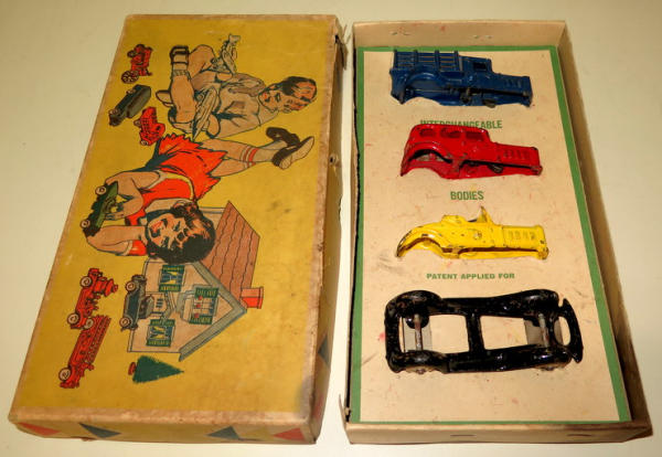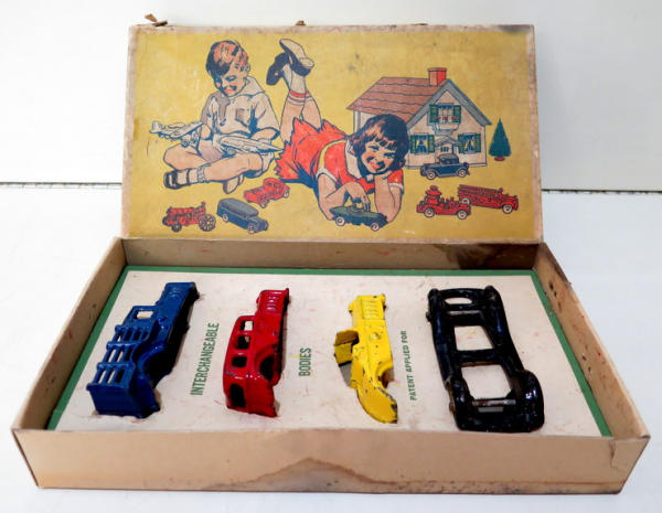4.5" car, toys are all about 85% condition, box is complete with liner, has some discoloration and general wear, hard to find any cast iron toy w/ the box, especially as a set