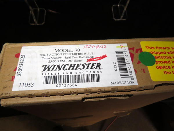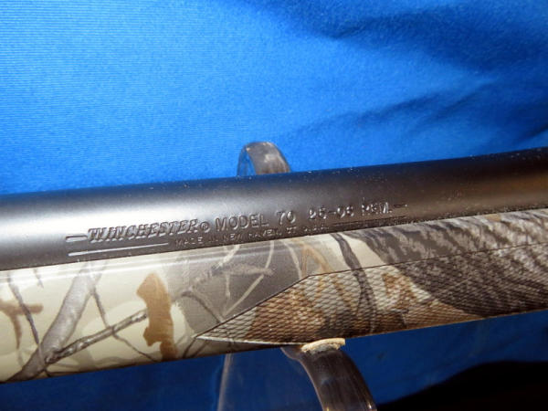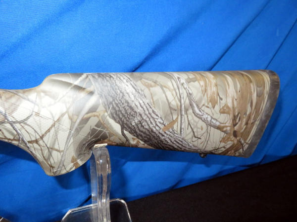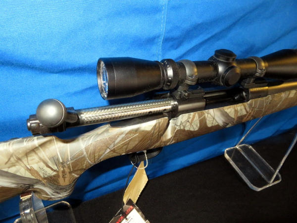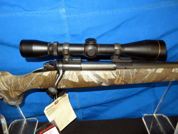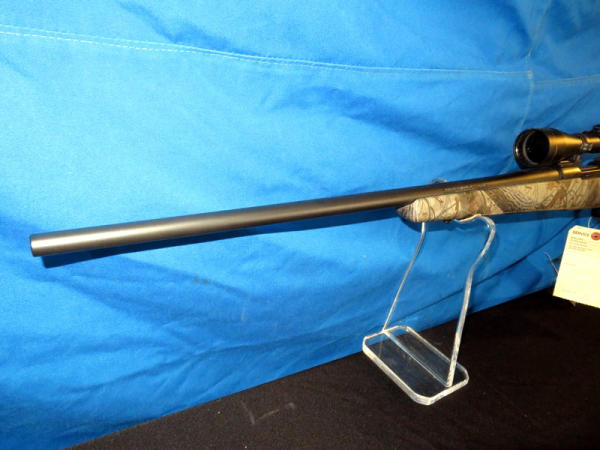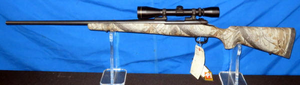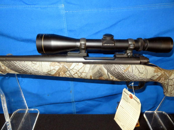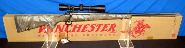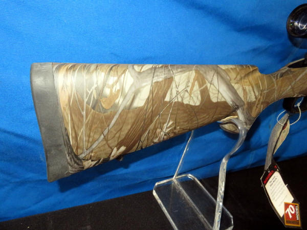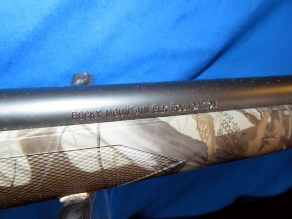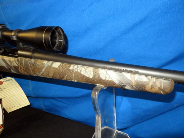 new & unfired; has original box; marked RMEF on barrel; Realtree Hardwoods camo synthetic stock; 24" BBL; no sights; smooth action; Leupold VX-1 3-9x40mm scope is very clear; nice looking firearm; SN#G2437384